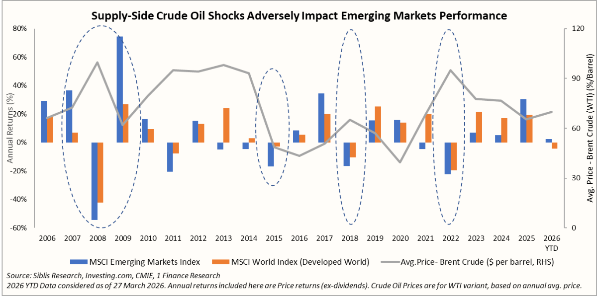 Crude oil is the third variable and the most important one for 2026. A demand-driven oil rally (such as 2005–2007) reflected strong global growth and supported EM earnings, particularly for commodity exporters. In contrast, supply-driven shocks such as the Russia-Ukraine War pushed Brent above $100 per barrel, fueling inflation and forcing central banks into aggressive tightening, triggering capital outflows from EMs.