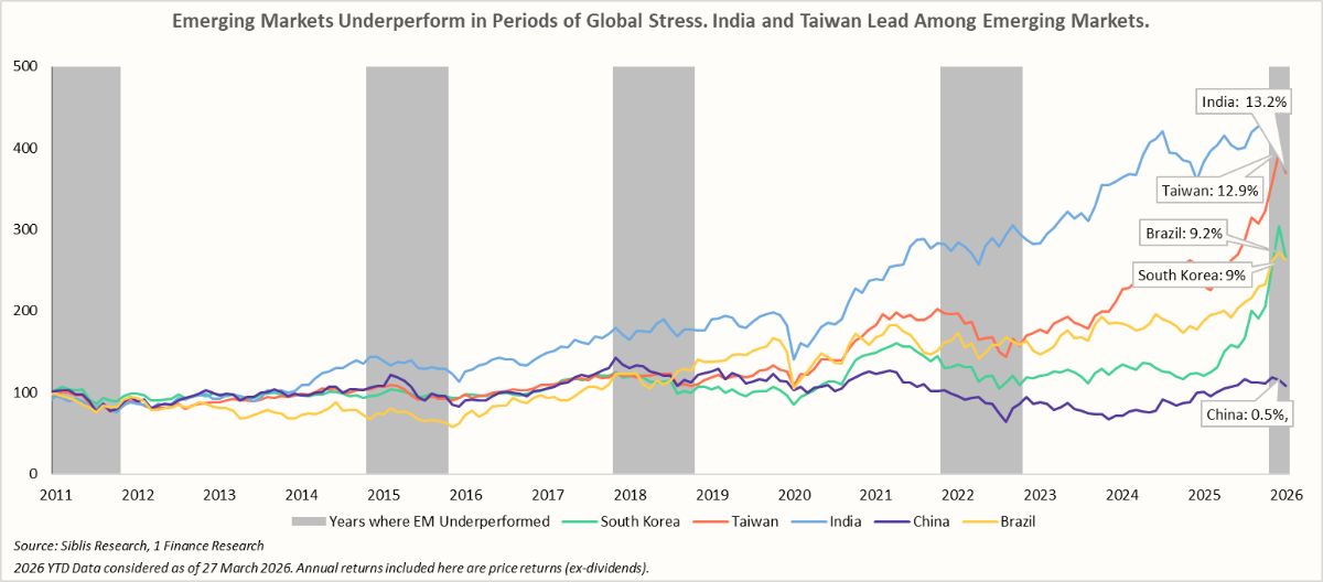 Emerging markets typically underperform during geopolitical stress, with sharp drawdowns seen in 2008, 2015, 2018, and 2022, periods marked by global shocks and tightening liquidity.