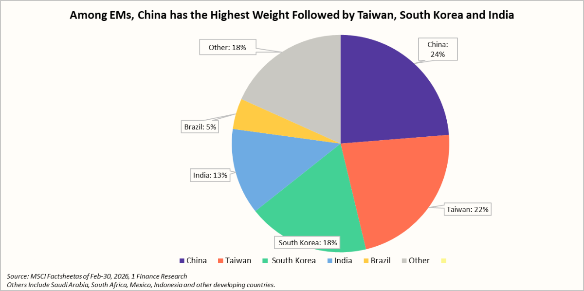 The EM index is dominated by China with 24% weight, followed by Taiwan (22%), South Korea(18%), India (13%), and Brazil (5%). This tilt means EM performance is heavily influenced by a handful of large, tech and semiconductor-heavy markets.