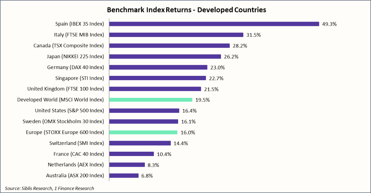 Within the developed markets, Spain led with 49.3% gains, followed by Italy (31.5%), Canada (28.2%), and Japan (26.2%).