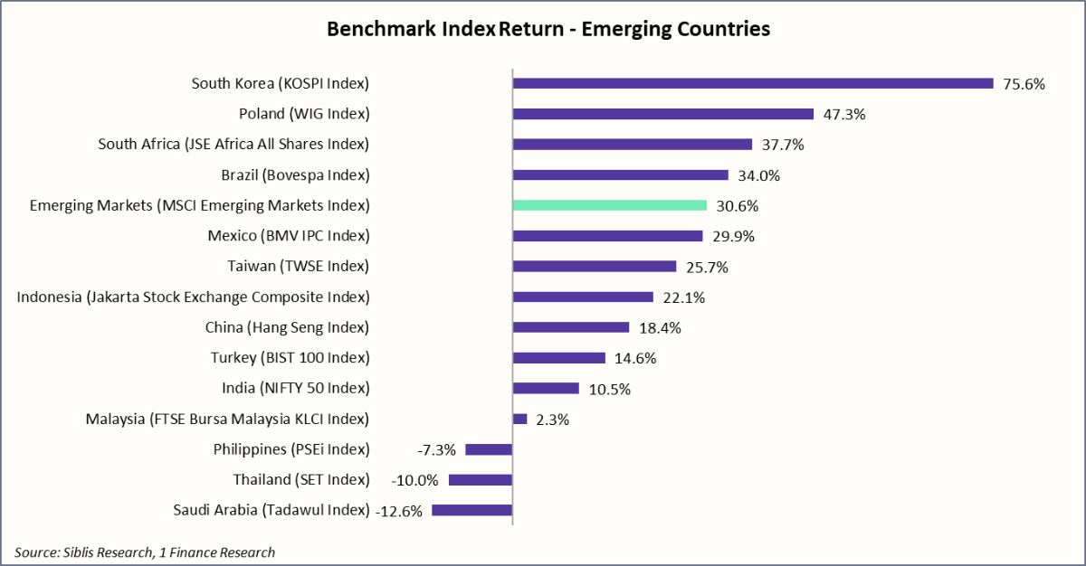 Performance within the index was also highly uneven. South Korea led decisively with a 75.6% gain, followed by Poland (47.3%), South Africa (37.7%), and Brazil (34.0%).