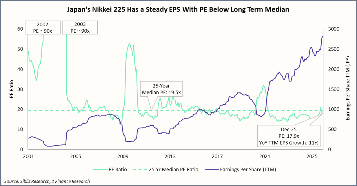 Japan’s Nikkei 225 was a steady outperformer, delivering a 26.2% return in 2025. As reflected in the chart below, its trailing twelve-month (TTM) EPS grew 11% in Dec-25. As of Dec-25, the Nikkei-225 continues to trade below its 25-year median P/E of around 19.5x, with valuations at approximately 17.9x.