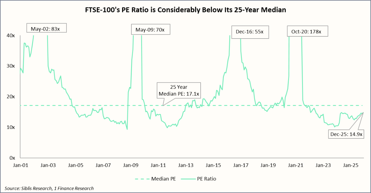 The UK’s FTSE-100 also gained 21.5% in 2025, ahead of the MSCI Developed World Index. As of Dec-25, it trades at a PE of 14.9x, well below its 25-year Median PE (17.1x) as highlighted in the chart below:
