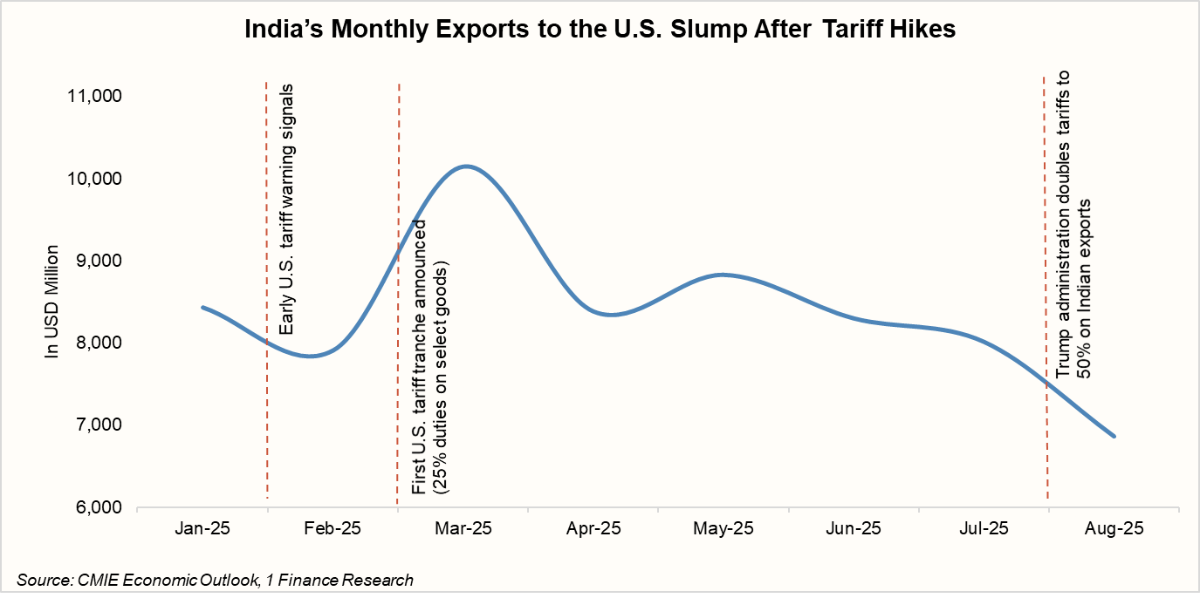 The U.S. decision to double tariffs to 50% on key Indian exports - textiles, gems & jewellery, footwear, furniture, and chemicals- has already slowed outbound shipments and threatens millions of export-linked jobs. September’s escalation, adding a 100% duty on branded pharmaceutical imports (a sector driving ~35% of India’s U.S. trade surplus), squeezes exporter margins and risks retaliatory measures. Beyond immediate earnings pressure, it clouds India’s manufacturing ambitions.