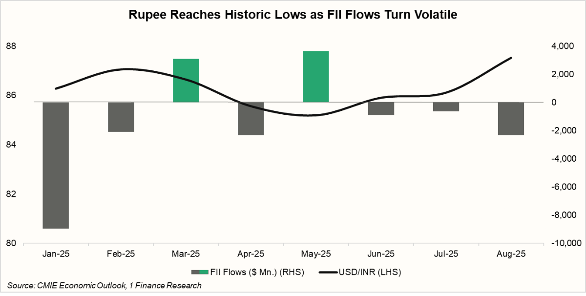The INR breached 88.7 per USD, approaching record lows as persistent FPI outflows, higher U.S. real yields, and elevated oil prices widen the current-account deficit (CAD). A weaker rupee inflates import costs, from crude to electronics, fuels inflation, and adds pressure on corporate margins. Volatility also raises risk premia, complicating RBI’s monetary management and investor sentiment.