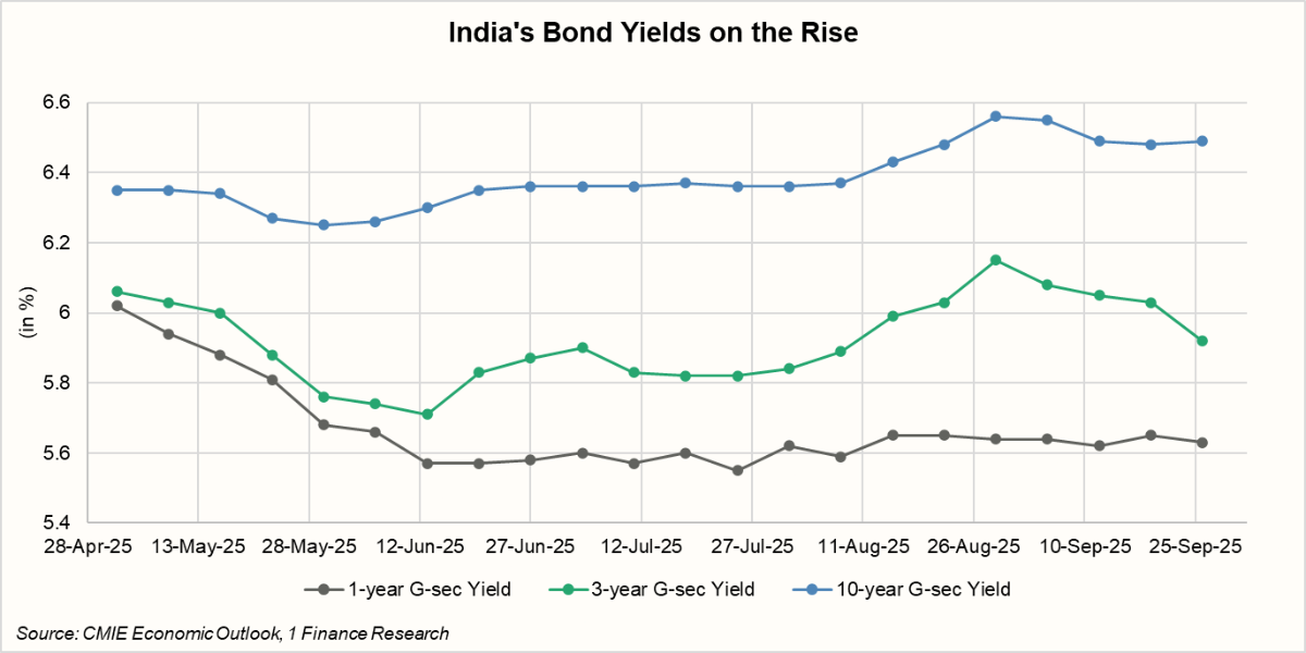 Even as the RBI cut rates earlier this year, 10-year G-sec yields spiked to 6.6% in late August. Initial optimism from S&P’s rating upgrade faded after GST rate cuts raised fears of higher fiscal deficits, with revenue loss estimated at ₹48,000 crore. Slower nominal GDP growth, tariff risks, and weak demand from banks and insurers added pressure. With the RBI pausing Open Market Operations, markets had to absorb extra supply, pushing yields higher. Yields eased once fiscal clarity emerged, but going forward, debt markets remain sensitive to government borrowing, inflation trends, and foreign inflows, keeping investors alert.