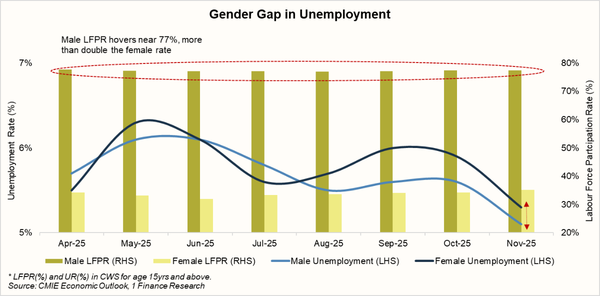 The silver lining is that rural India is showing stronger female LFPR growth, aided by self-help groups, agricultural cooperatives, and government initiatives such as Women Entrepreneurship Platforms. Sustaining this momentum will require policy incentives for companies to hire women, improved transport infrastructure, and expanded childcare facilities.