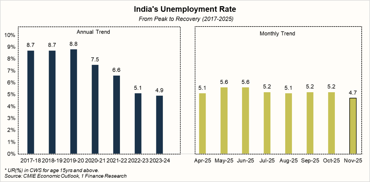 India’s unemployment rate has eased, settling at 4.7% in November 2025, down from 5.2% in October and a peak of 5.6% in June. This downward drift, though modest, indicates a labour market that is gradually stabilising after a period of global economic uncertainty and domestic election-related slowdown.