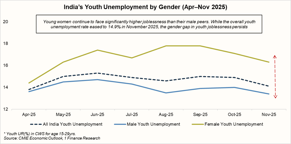 India’s youth unemployment rate (ages 15–29) has eased to 14.9% in November 2025 from the peak of 17.8% in September 2025. Within this group, female youth unemployment (~16.3%) far exceeds male youth unemployment (~13.4%), underscoring persistent gender disadvantages.