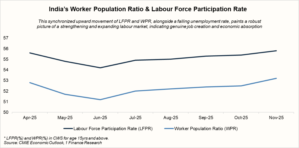 | Worker Population Ratio (WPR) | 53.2% | 52.5% | ▲ Improving |