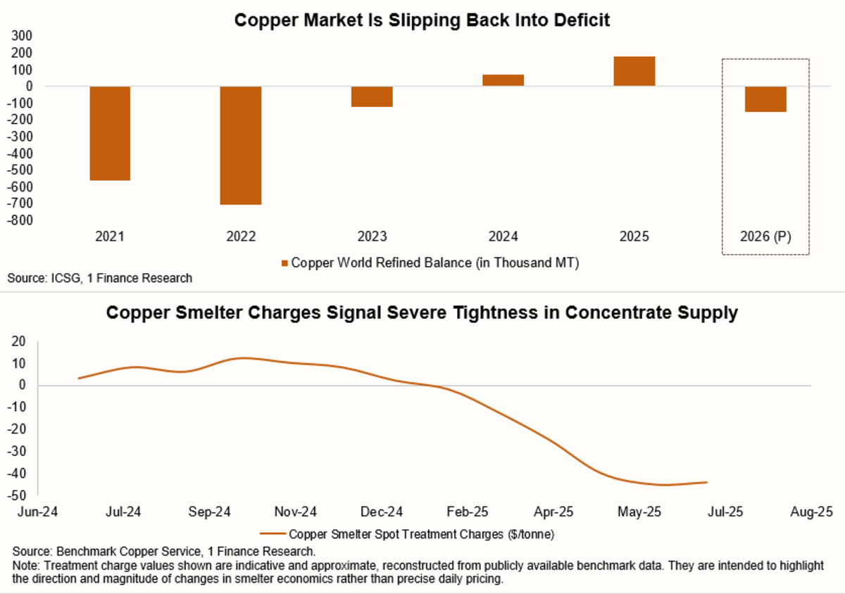 The stress is already showing up in the physical copper market. One clear sign is what’s happening to treatment and refining charges — the fees smelters earn for processing copper concentrate into metal.