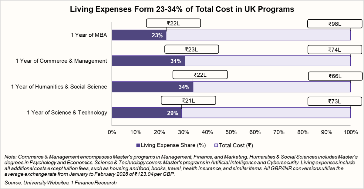 The UK appears relatively lower at 23-34%, largely because most master’s programs are completed in one year. Even then, students typically spend ₹21-23 lakh on living costs alone.