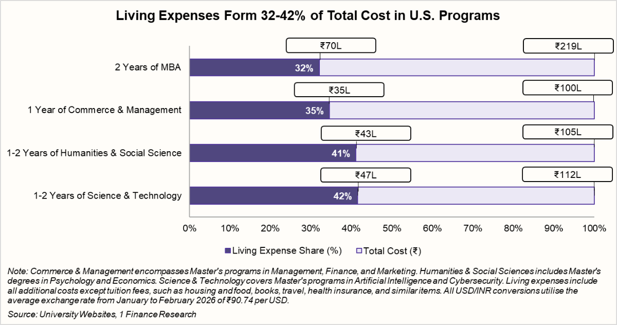 In the U.S., living expenses account for about 32-42% of the total program cost. For a two-year MBA, this amounts to nearly ₹70 lakh spent solely on accommodation, food, insurance, and daily living expenses. Even for shorter programs, students may spend ₹35-47 lakh outside of tuition.
