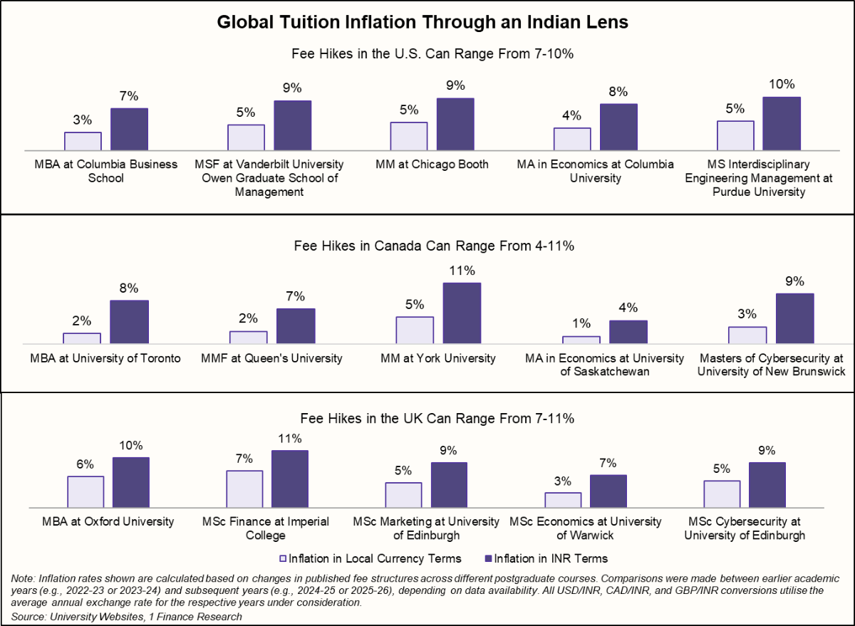 In our earlier analyses, we looked at how education inflation is rising steadily within India across school education, undergraduate, and postgraduate programs. The trend is now visible globally as well. International education today involves much more than tuition fees. Families are facing rising living costs, a weaker rupee, and higher upfront financial requirements.