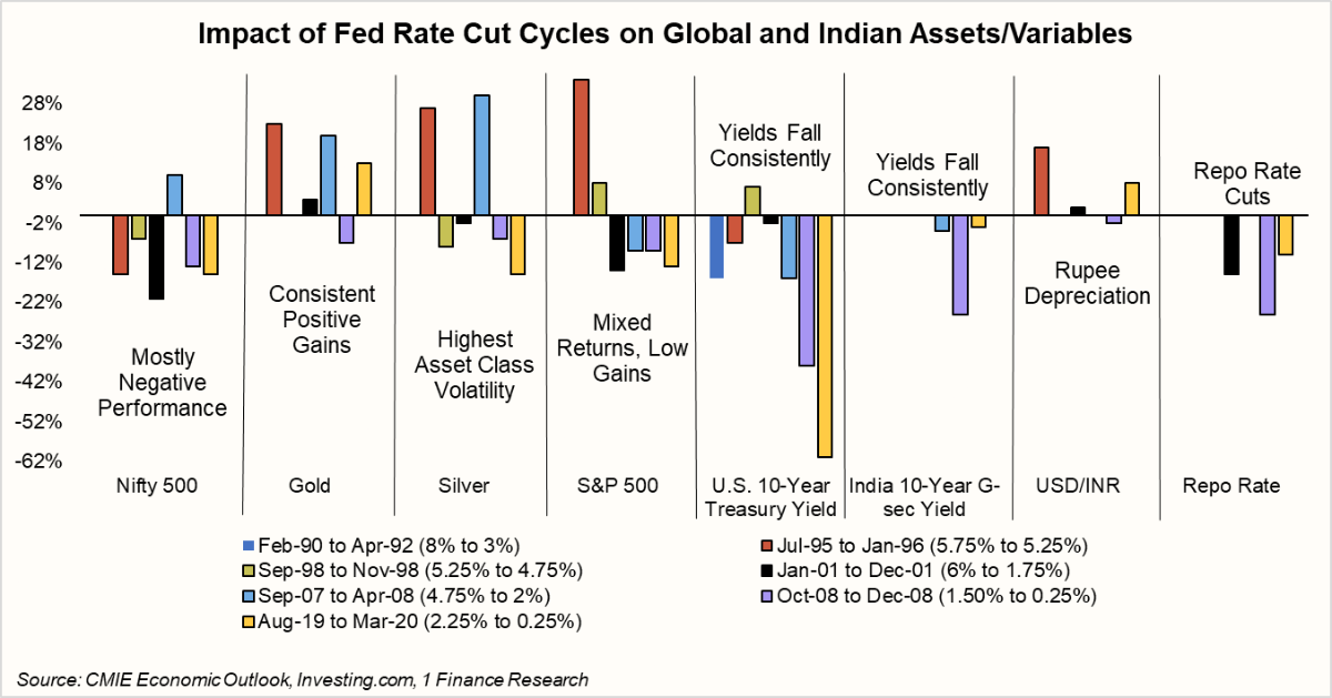 Note: The chart values indicate the percentage change in each variable measured from the beginning to the end of the Federal Reserve’s rate-cutting cycle. All performance figures are presented in INR terms.