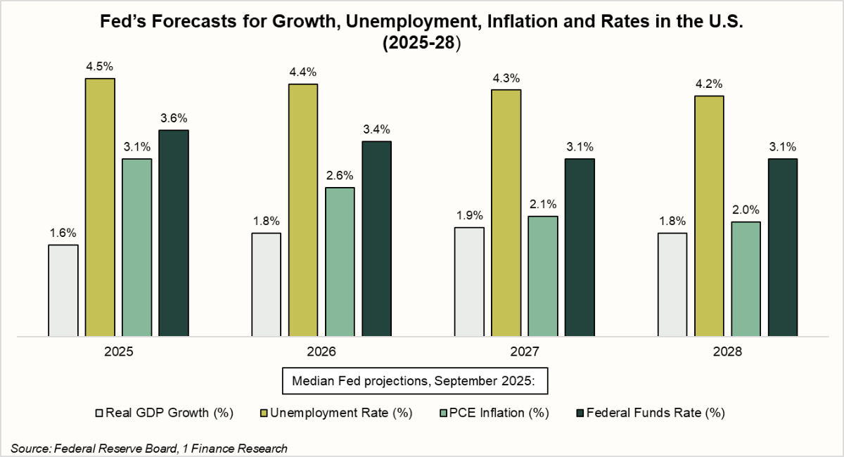 Multiple questions have been raised following the FOMC's release of its projections for various indicators on September 17, 2025. As shown in the chart below, GDP growth is projected to rise from 1.6% in 2025 to 1.9% in 2027, before slightly easing to 1.8% in 2028. Meanwhile, the unemployment rate is expected to gradually decline from 4.5% in 2025 to 4.2% in 2028.