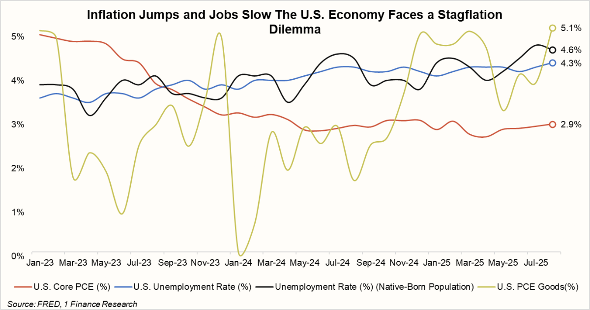 The slowdown in hiring reflects growing strain across households and businesses alike. Tariffs and a shrinking immigrant workforce are starting to weigh on growth, but the primary drag remains sticky inflation. This persistent price pressure is now showing renewed momentum: After months of volatility, U.S. PCE goods inflation jumped to 5.1% in August 2025, showing renewed price pressure in consumer goods. Core PCE inflation, the Fed’s preferred gauge, has stalled near 2.9%, still well above the 2% target.