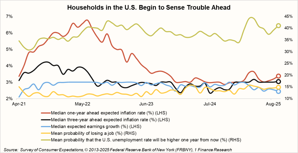 The September 2025 Survey of Consumer Expectations by the New York Fed provides a glimpse of this shift in sentiment. One-year ahead inflation expectations rose to 3.4% in September 2025 from 3.2% in August 2025, while three-year expectations nudged up to 3.1% in September 2025 from 3% in the previous month. The rise was most pronounced among lower-income households and those with only a high school education, groups typically most sensitive to price changes.