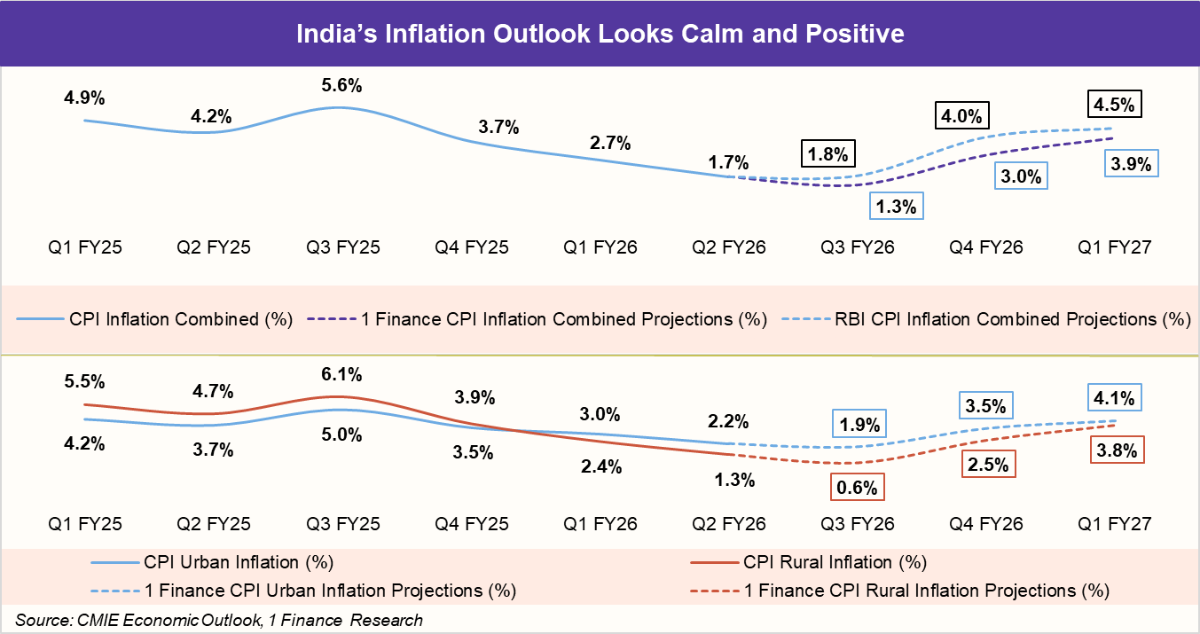 Falling inflation is setting the stage for a possible rate cut. Thanks to easing food prices, retail inflation fell to an eight-year low of 1.5% in September 2025. While the RBI expects the FY26 inflation to be around 2.6%, we expect inflation to be slightly lower at 2.2%. Breaking it down further, urban inflation is likely to hover near 2.7%, with rural inflation even gentler at 1.7%. Overall, the outlook points to stable prices, with only a modest uptick expected toward the fourth quarter of FY26.