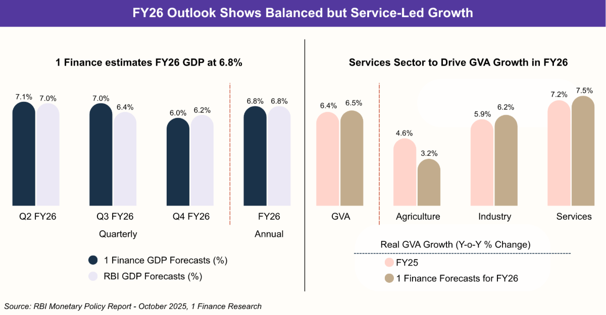 Looking ahead, 1 Finance expects FY26 real GDP growth at 6.8%, broadly in line with the RBI’s projection, with activity peaking in Q2 and easing through the second half. Against this backdrop, the RBI’s 22 structural reforms aim to unclog credit, boost liquidity, and support SMEs. Services are likely to remain the key growth driver, with service GVA growth estimated at 7.5% for the year.