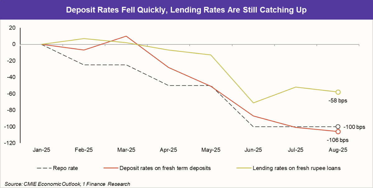 Between February and August 2025, the repo rate was cut by 100 bps, yet the impact on lending rates has been gradual. Deposit rates have dropped by 106 bps, but lending rates on fresh rupee loans have fallen only 58 bps. This gap indicates that RBI is waiting for the full transmission before taking the next step to support growth.