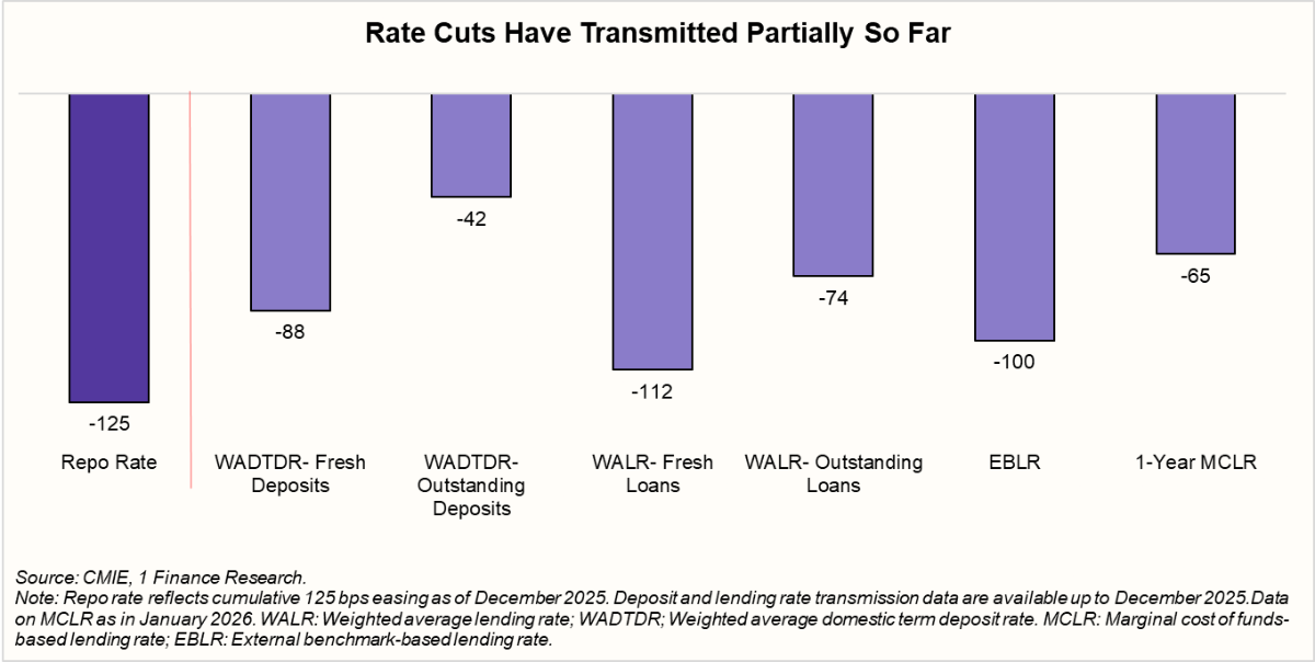 First, transmission is still incomplete. While policy rates have moved earlier in the cycle, lending rates, especially in fixed-rate segments and older loan books, have adjusted only gradually. For many borrowers, the benefit of past policy moves has yet to fully pass through.