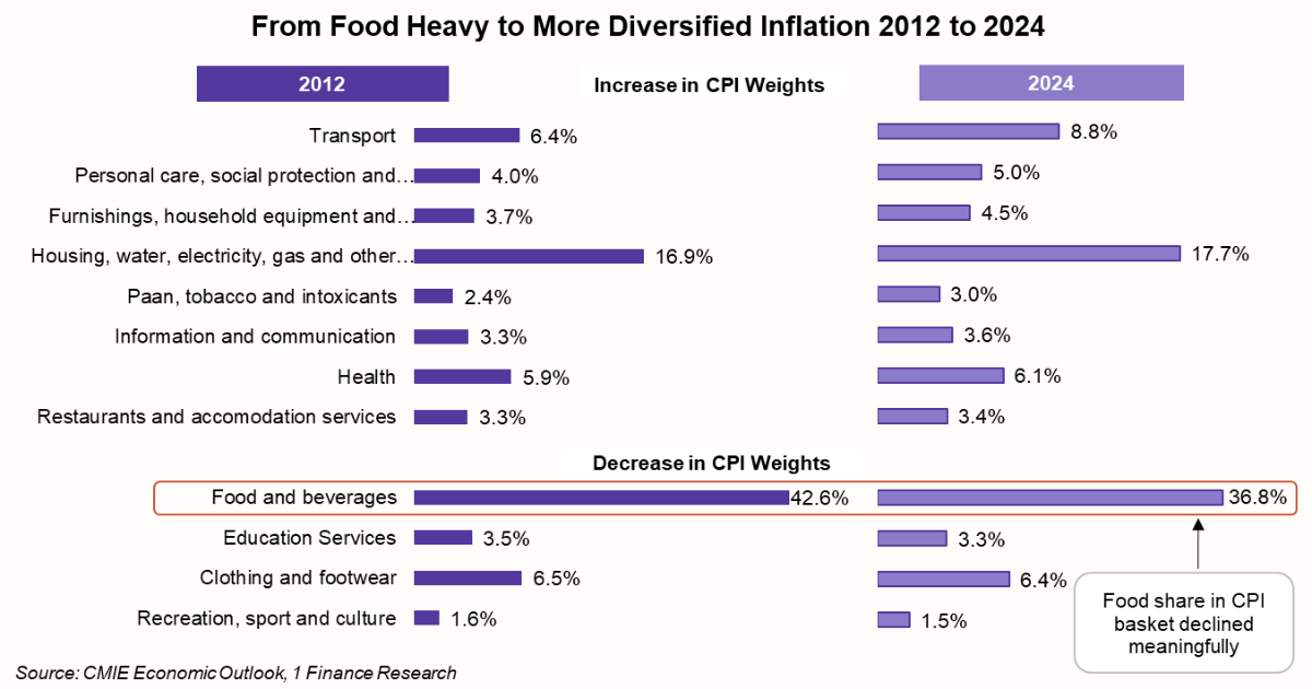 The new series draws from the 2023-24 Household Consumption Survey. It better represents today’s consumption patterns, reflecting a more modern and aspirational India. It moves away from the earlier food-heavy structure toward a more balanced and realistic consumption basket.