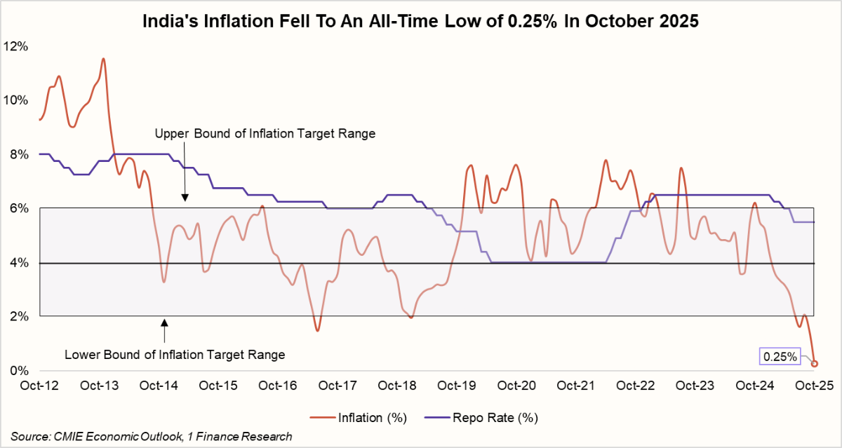 Now that we’ve covered the trade positives, here’s another great update! Retail inflation tumbled to an almost unbelievable 0.25% in October 2025. This is the lowest reading since the 2012 base series began. This sudden cooling does more than just fill household wallets. It hands the RBI a powerful policy lever.