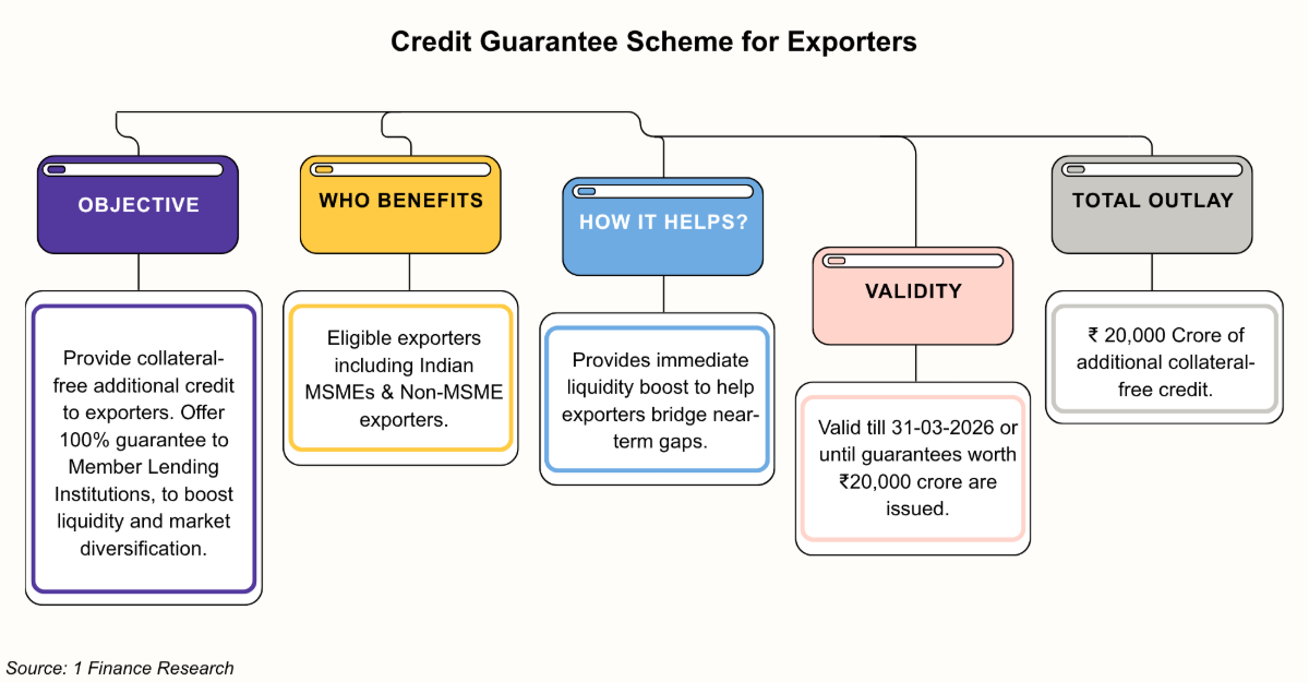 Meanwhile, CGSE offers an extra ₹20,000 crore in collateral-free credit. This will give Indian exporters the liquidity they need after the recent tariff shocks.