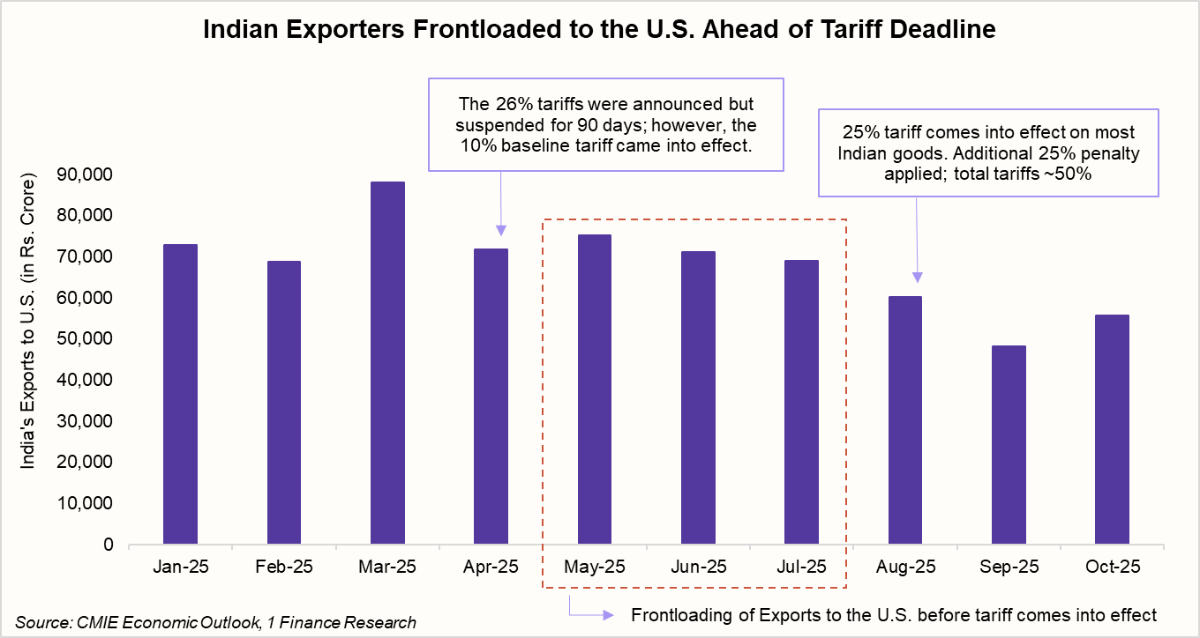 In fact, a lot of frontloading occurred right after the announcement of the tariffs. The graph below illustrates this. Right after President Trump announced tariffs in April 2025, exports to the U.S. peaked around ₹75,000 crore in May 2025. But once those tariffs officially hit, the momentum collapsed, with exports dropping to ₹48,200 crore by September. Some recovery followed in subsequent month, though volumes remained well below their pre-tariff peak.