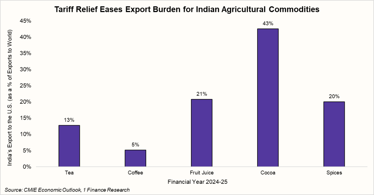 Now, on top of that, another good news came in on November 14, 2025, U.S. President Trump rolled back tariffs on several food products. This was due to a huge surge in grocery prices there. The move offers mild relief to Indian exporters, with cocoa, spice and fruit juice exports to the U.S. likely to benefit the most. The chart below shows India’s share of U.S.-bound exports as a percentage of global exports for these commodities in FY25.