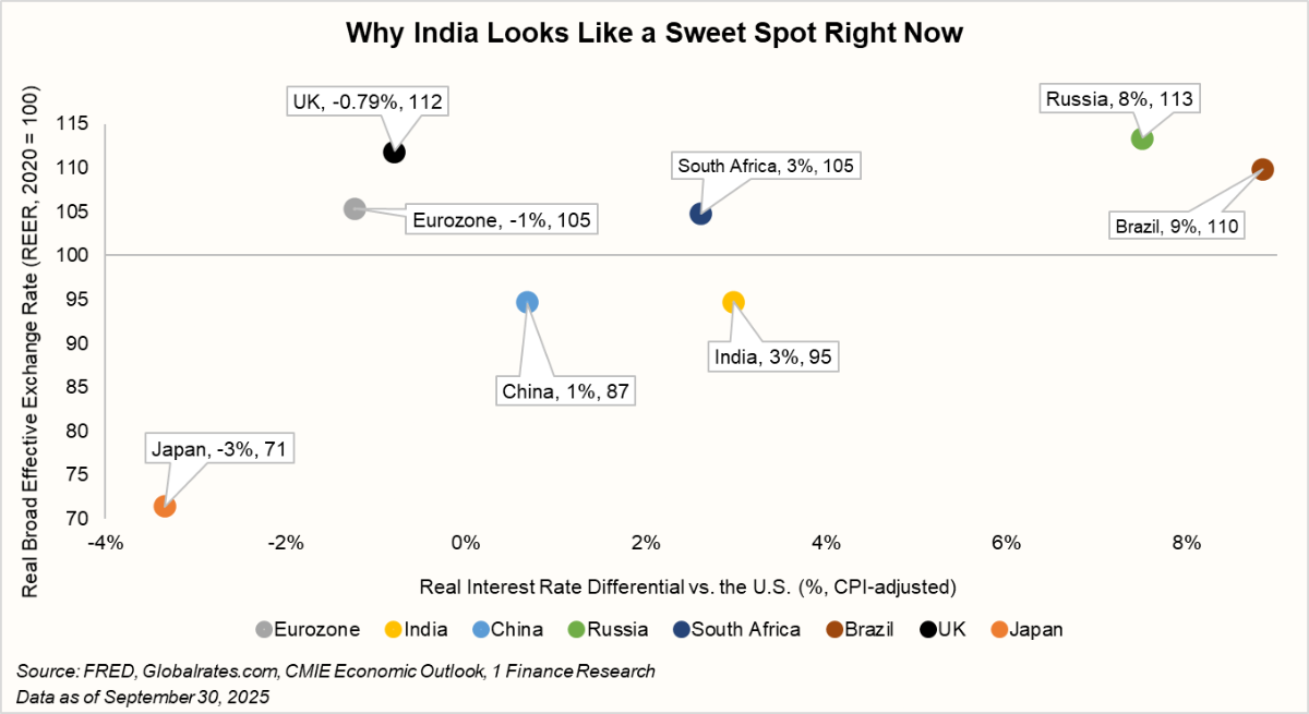 India’s interest rate differential v.s. the U.S. is at 3% and REER is at 95. This gives India a rare edge: strong returns supported by an attractive currency. This pairing sets India apart. Other economies offer only parts of this mix. Brazil has high real rate gaps but an overvalued currency.